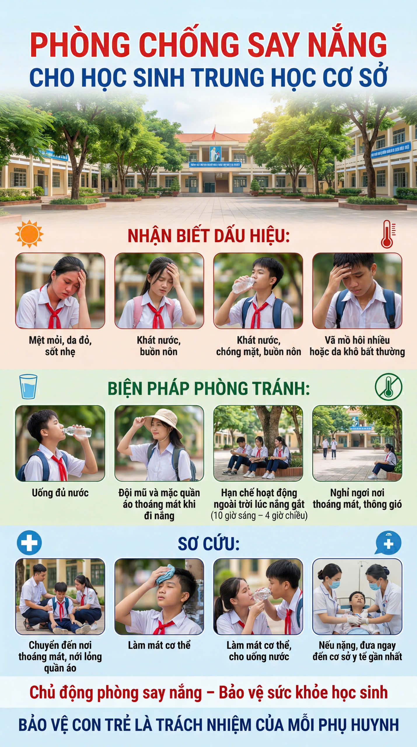 Say nắng, say nóng hoàn toàn có thể phòng tránh được nếu chúng ta biết cách bảo vệ bản thân. Mỗi học sinh hãy chủ động giữ gìn sức khỏe, thực hiện tốt các biện pháp phòng chống để có một mùa hè an toàn, vui khỏe.